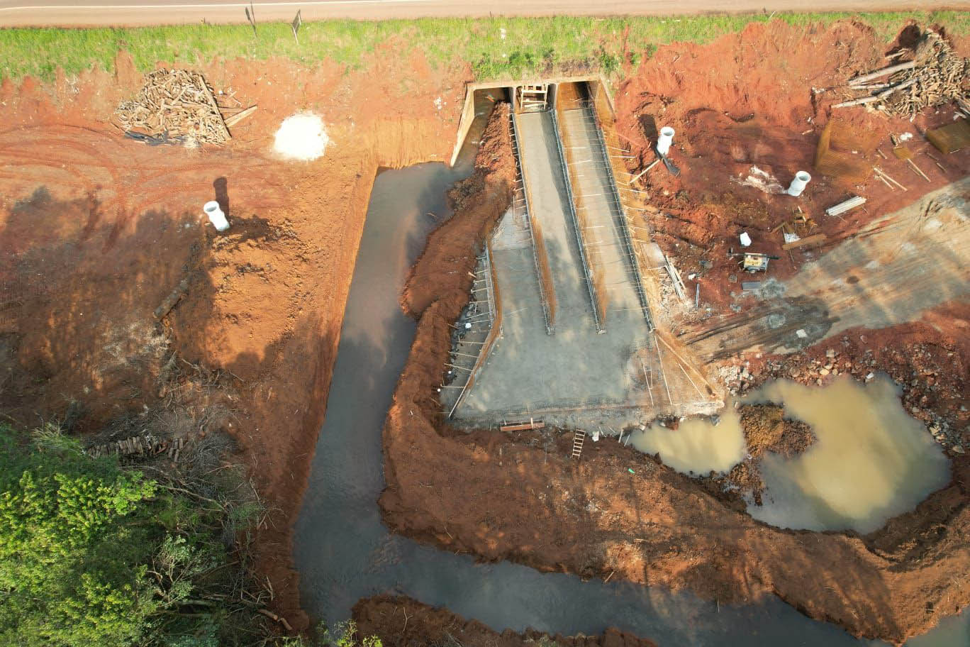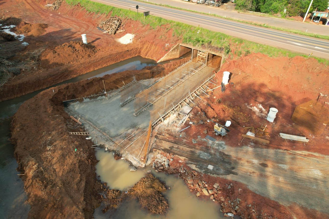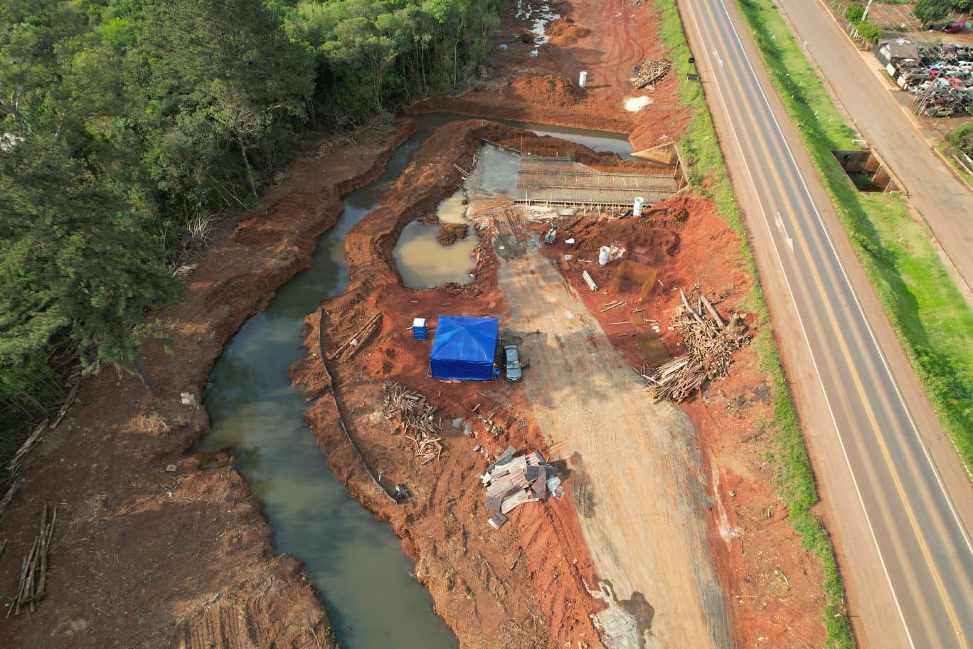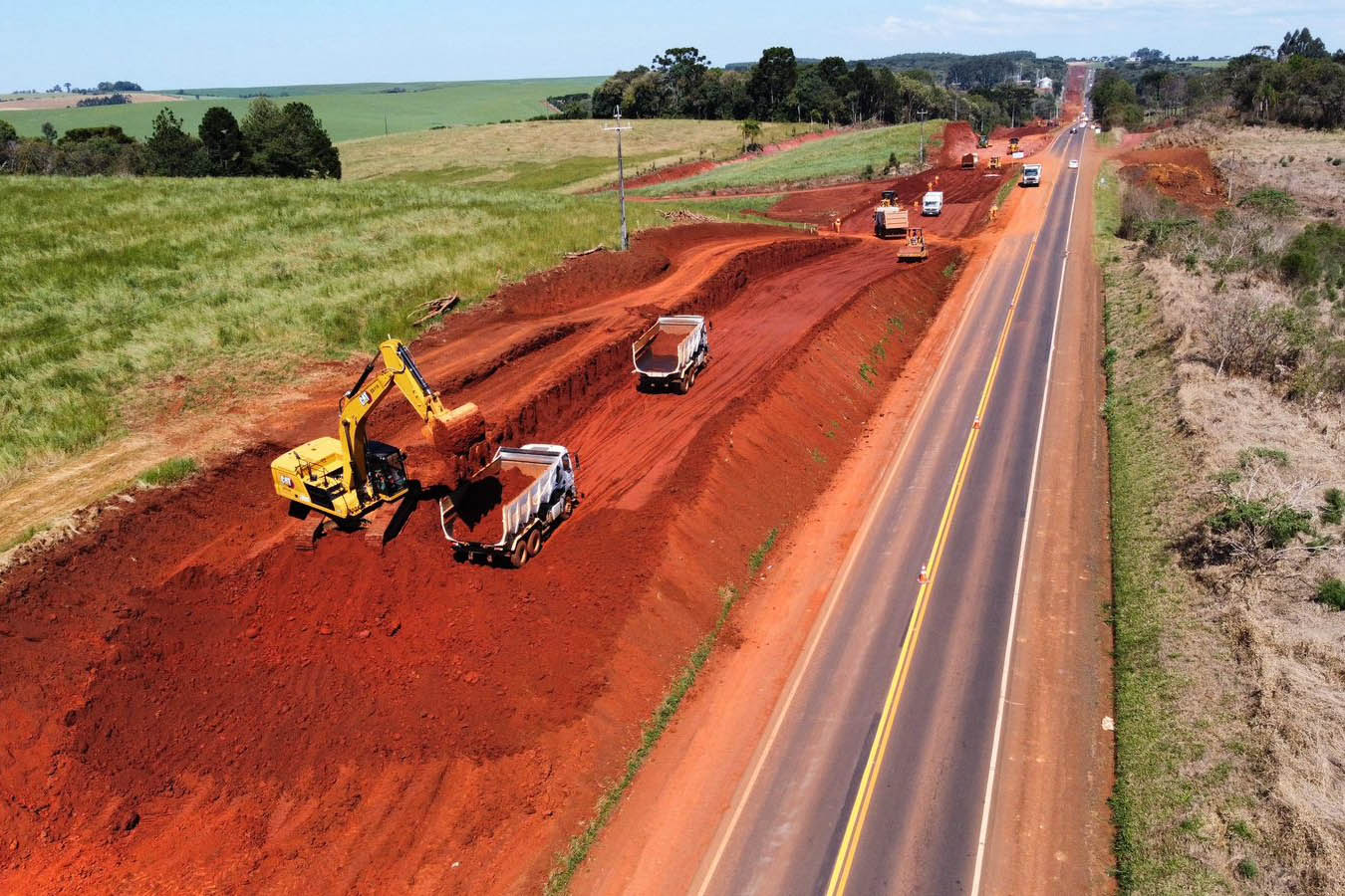 Os principais serviços em andamento são a terraplenagem no espaço ao lado da pista existente para implantar a plataforma da nova pista, e a implantação de dispositivos do sistema de drenagem de águas.