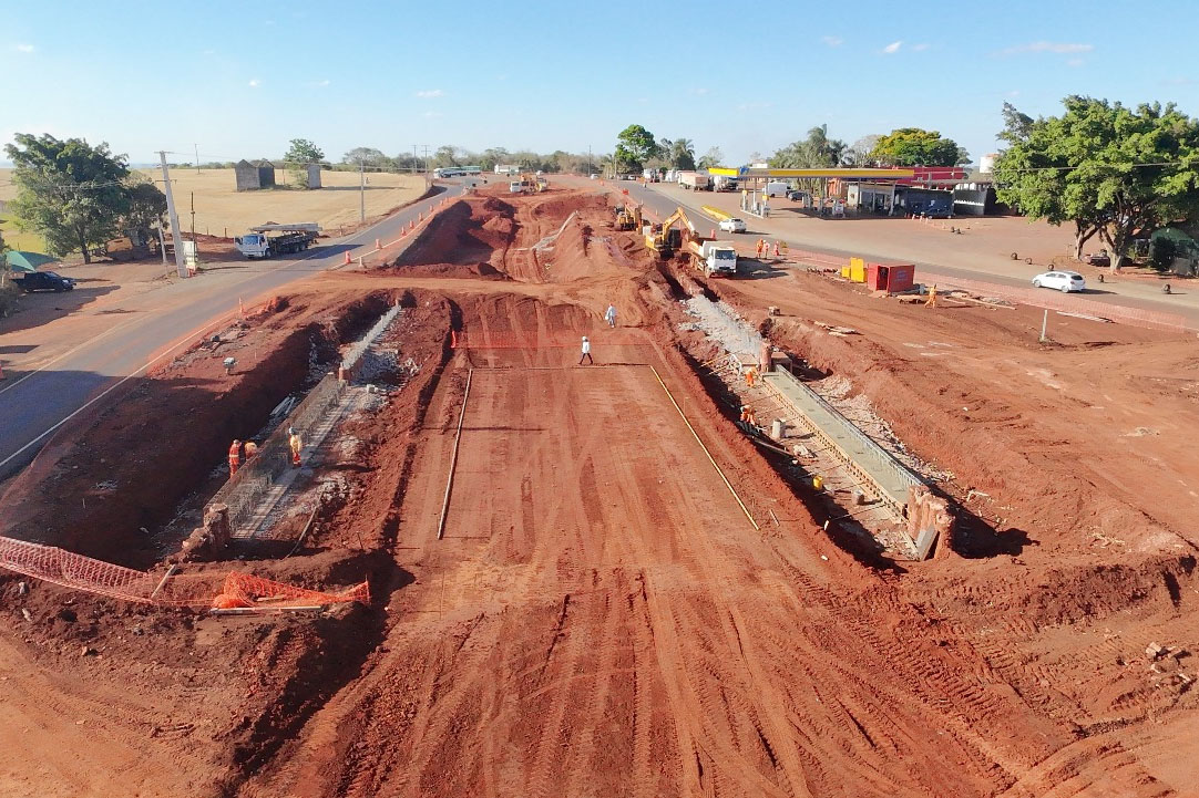 Estão em andamento a terraplanagem, implantação do novo sistema de drenagem de águas, contenções e os serviços iniciais da estrutura do viaduto, com a moldagem das vigas das cabeceiras.