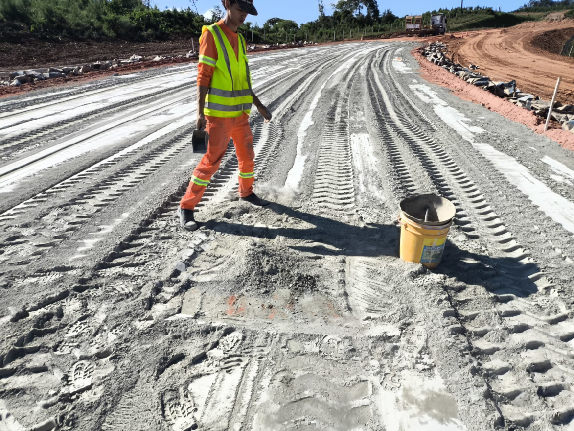 O solo-cimento é uma mistura de cimento com o solo local, resultando em um material com aparência de terra, mas com consistência firme e compacta, sustentando a pista acima. Nesse trecho está previsto o pavimento semirrígido, com duas camadas de solo-cimento ligadas por uma camada de ligante betuminoso, e uma camada de concreto asfáltico usinado a quente (CAUQ).