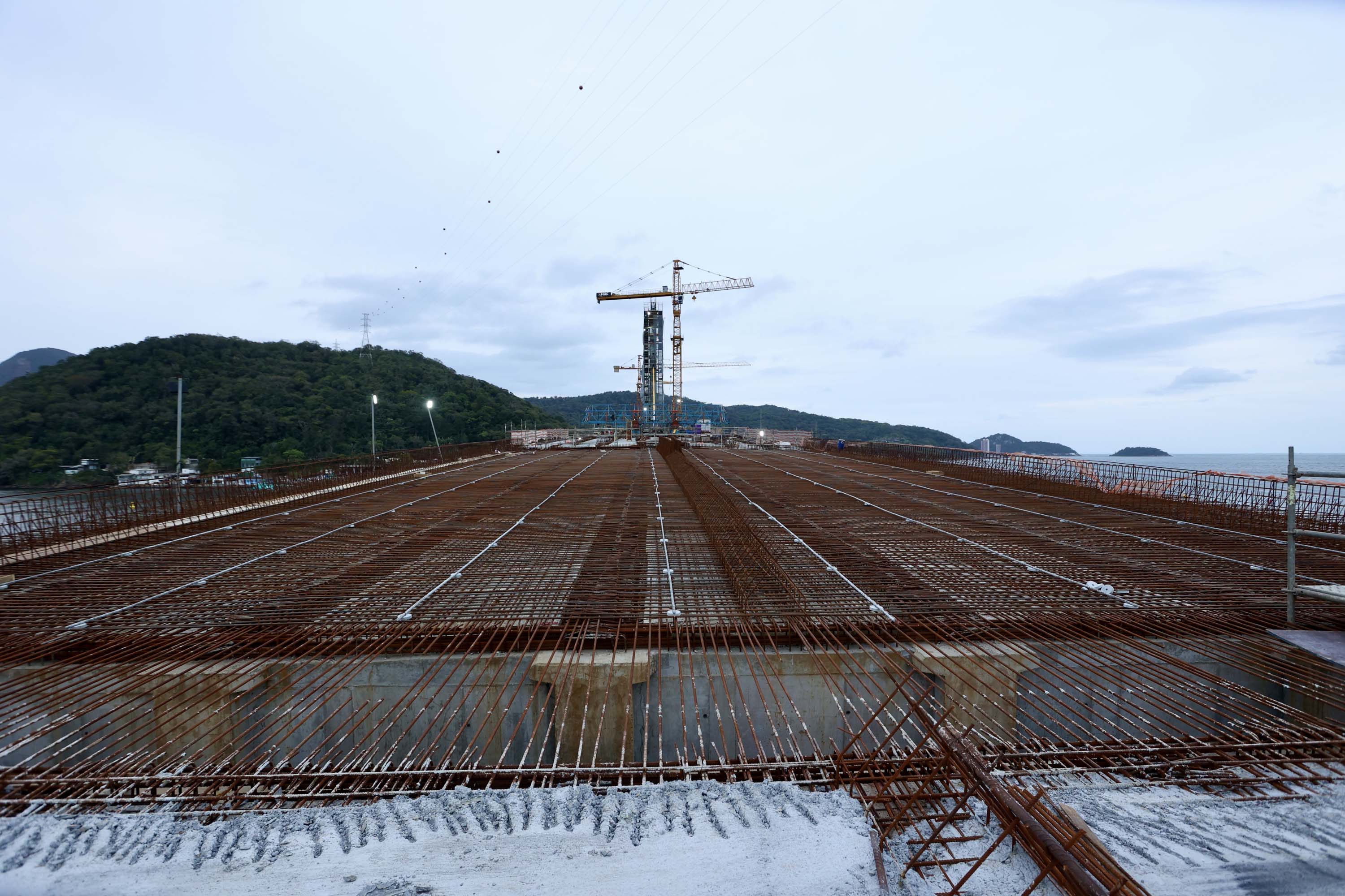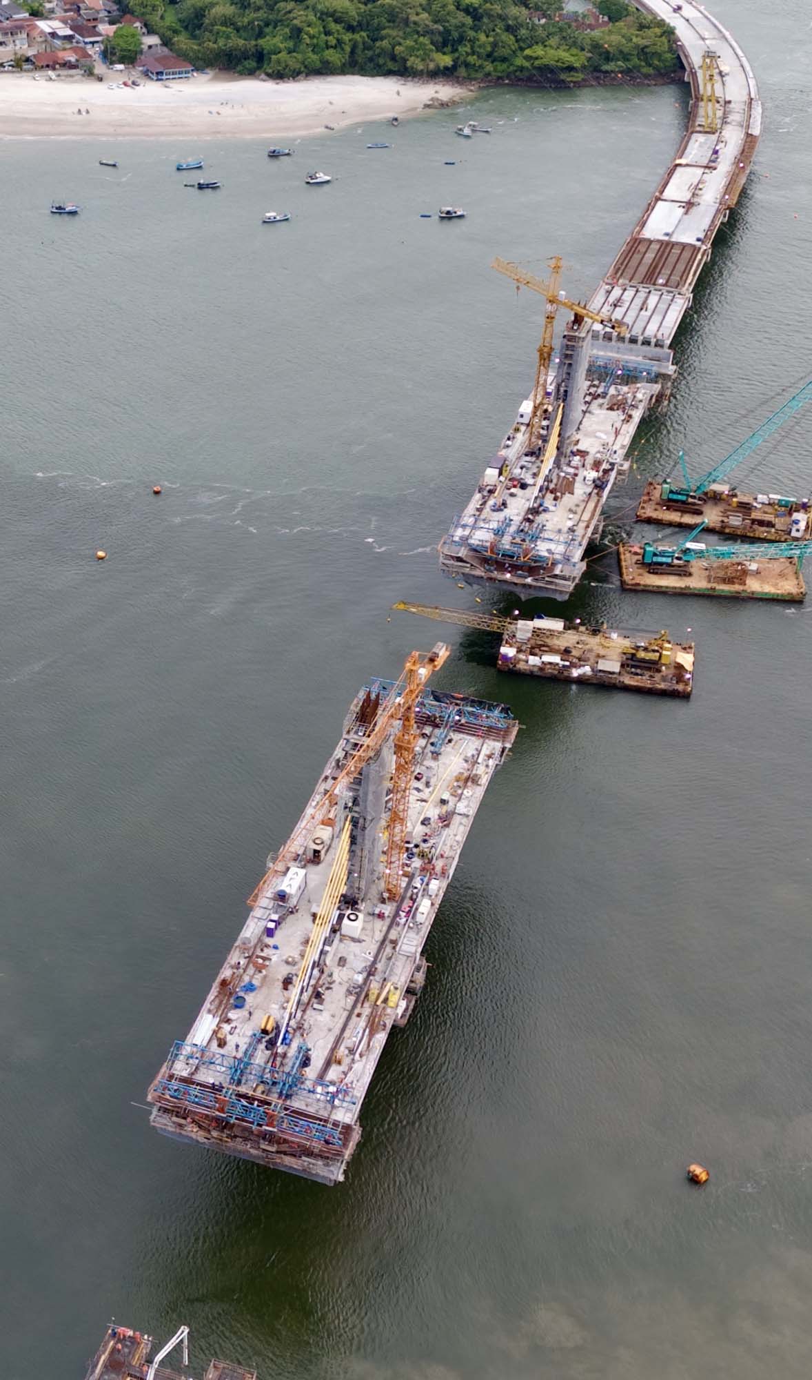 TRECHO ESTAIADO – O trecho estaiado da ponte, responsável por vencer o vão-livre de 160 metros sobre o canal de navegação da Baía de Guaratuba, avança com o método de balanços sucessivos. No apoio 4 já foram executados sete pares de aduelas, somando 92 metros, e no apoio 5, seis pares, totalizando 81 metros. O avanço acumulado nesse trecho chega a 173 metros dos 320 metros previstos. Também foram instalados cinco pares estais no apoio 4 e quatro pares no apoio 5.