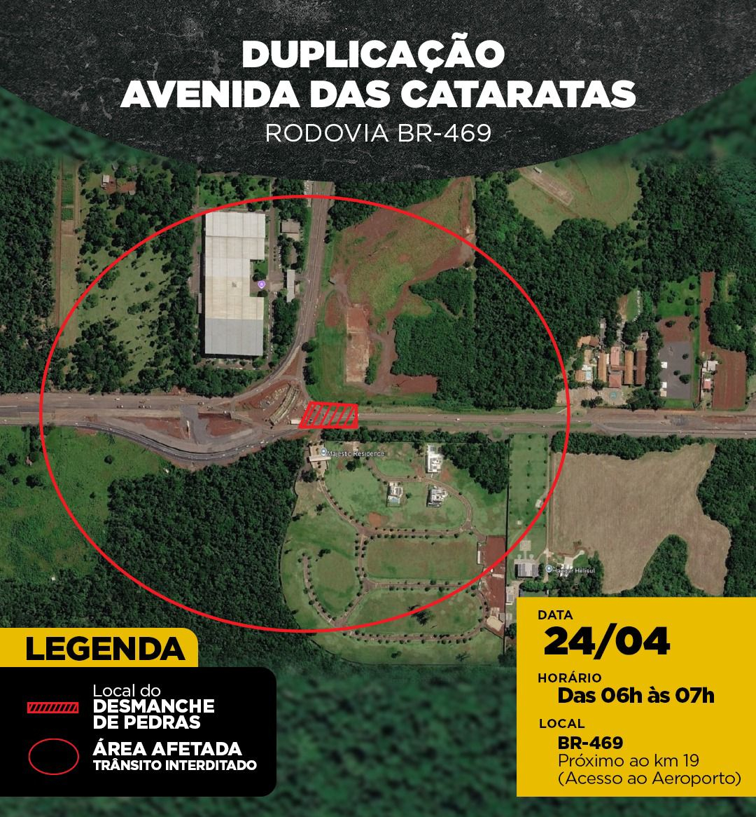 O Departamento de Estradas de Rodagem do Paraná (DER/PR) informa que a Rodovia das Cataratas (BR-469) em Foz do Iguaçu, na região Oeste, será interditada na próxima sexta-feira (24) para uma nova detonação de rochas.